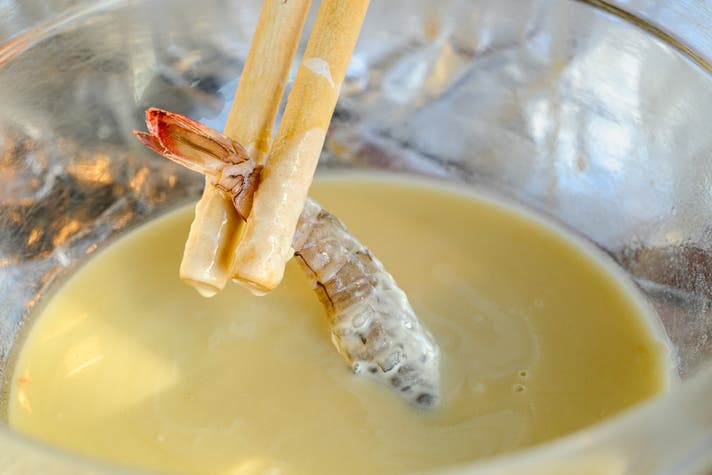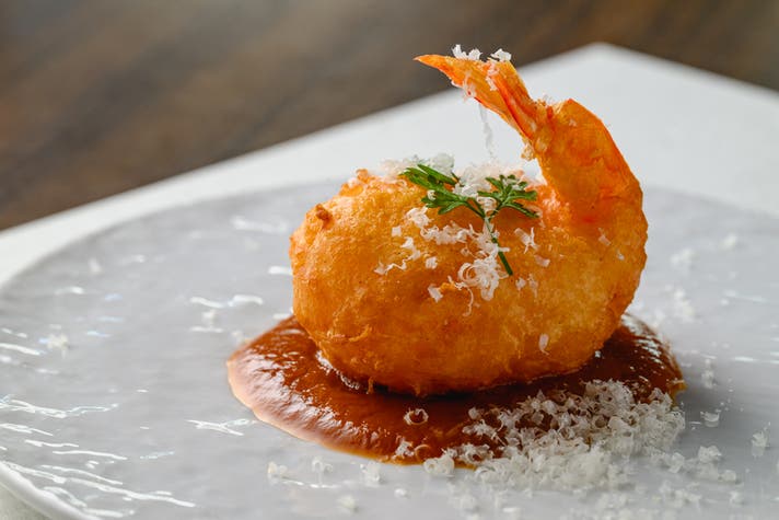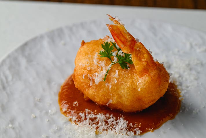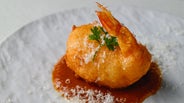 本日のお刺身3種で、素材の鮮度の良さを感じていただいたあとは、当店のスペシャリテである神の海老フリット アメリケーヌソースが登場。