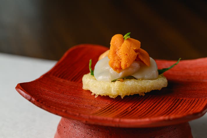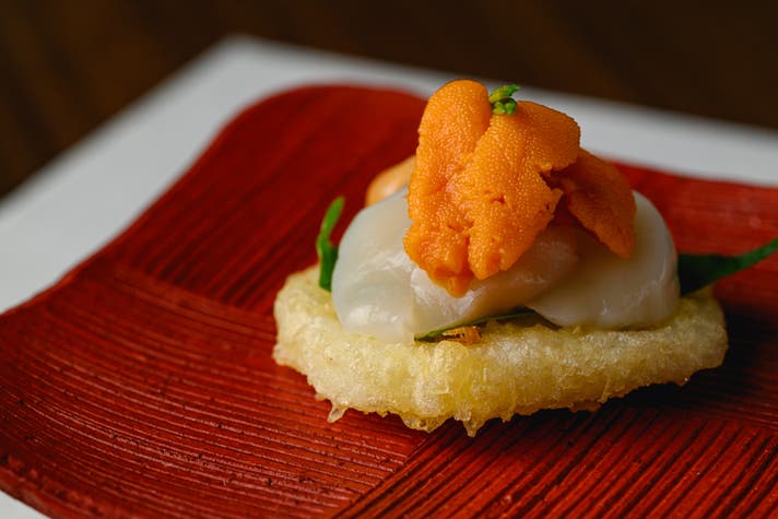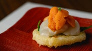 ハスの天ぷらにホタテといくらを乗せてカナッペ仕立てにアレンジするなど、その発想は独創的。
