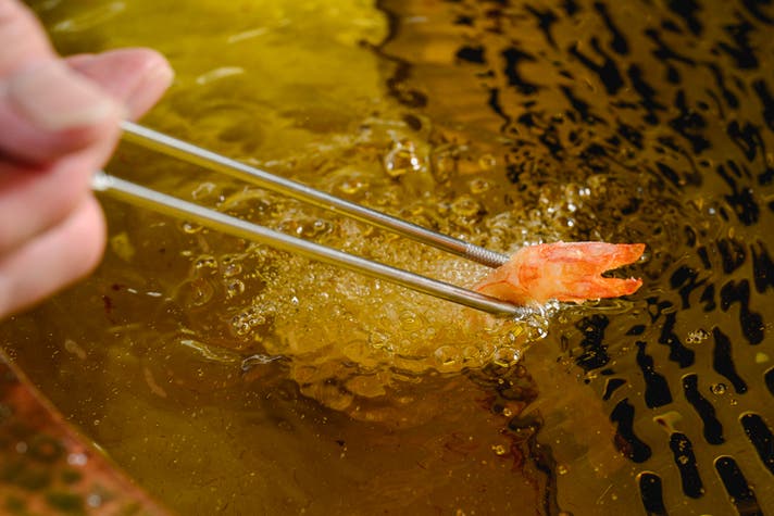どこかバーを思わせる親密な雰囲気のなか、目の前で天ぷらが揚げられ、最後のソースの仕上げまでライブ感たっぷりに供されます。
