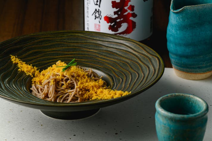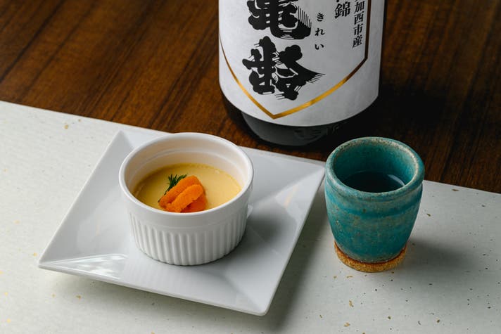 雲丹のフランには信州亀齢の上品な甘みを添え、締めの唐墨そばにはみいの寿の辛口でキレよく仕上げ。