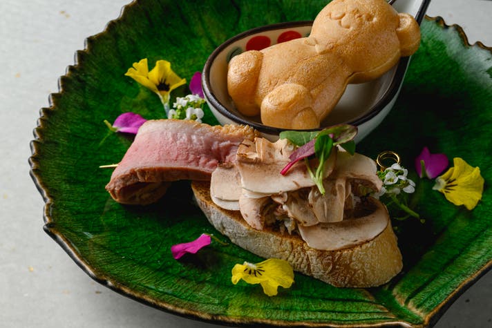 幕開けを飾る本日の前菜3種は、いぶりがっこを練り込んだチーズを、愛らしいくま型の最中に忍ばせたひと品に、しっとりとした鴨のロースト、ブルスケッタを添えて。