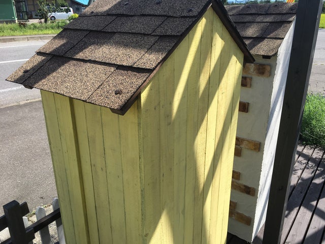 カントリータイプの小箱は板張りにペンキ仕上げの味ある仕上がりになってます。木部の収縮もあり、経年変化での味わいが出てきます。屋根材も塗装を必要としない素材で、積雪も1m位は青森で検証済みです。
