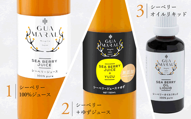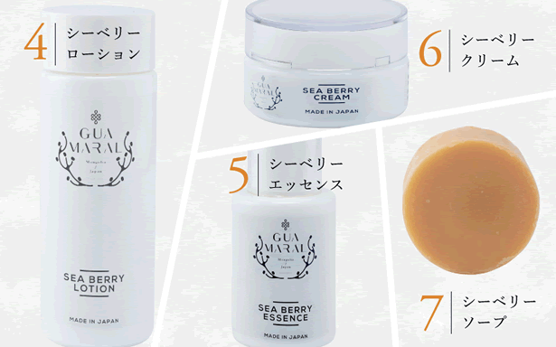 グアマラルシリーズ最大の特長は、栄養が詰まったシーベリーエキスをカラダの内外から継続的に取り入れるために厳選した全7製品のラインナップです。