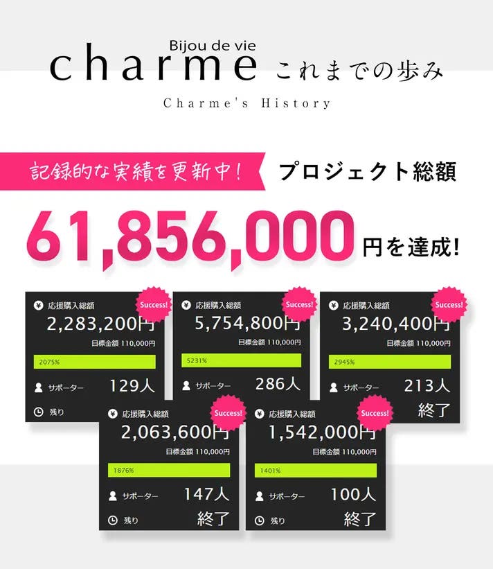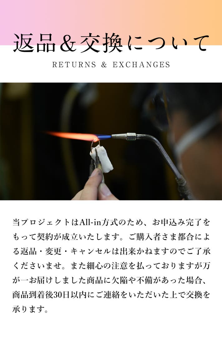 私たちは【シャルムジュエリー】を制作するために、工場とデザイン・仕様を実現できるよう、プロジェクトを誠心誠意進めています。 しかしながら開発中の工程において、デザイン・使用が一部変更になる可能性もございます。製造スケジュールについては、プロジェクト成功を想定した数で調整しておりますが、想定を上回る応援の申し込みがあった場合、製造や発送に伴うやむを得ない事情によりお届けが遅れる場合がございます。上記のようにプロジェクトページに記載している内容に変更がある場合は、活動レポートなどで共有を行っていく予定です。 本文中に記載させていただいたスケジュールは、あくまでプロジェクト公開時点の予定です。応援購入の性質上、配送遅延のおそれがございます。 原則として、配送遅延に伴う応援購入のキャンセルはできませんが、リターン配送予定月から3ヵ月を超えた場合には、希望者に限りキャンセルにて対応させていただきます。