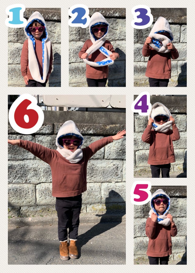 マフラー部分のバンドをねじって被るだけの簡単装着。
