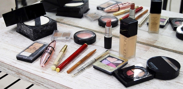 引き出しや、かご、メイクポーチにしまっているコスメグッズたち。