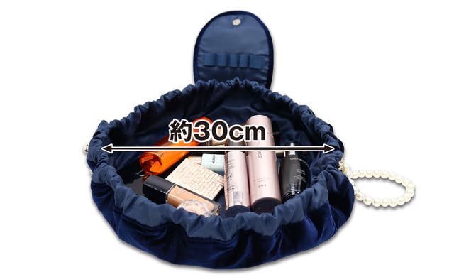 ①パッと広げて一目瞭然。ガバッと開くので、ポーチの中でコスメグッズを探す必要はありません。しっかりとした表地素材と絶妙な紐の長さ調整により、広がりすぎてコスメグッズがこぼれてしまうことはありません。