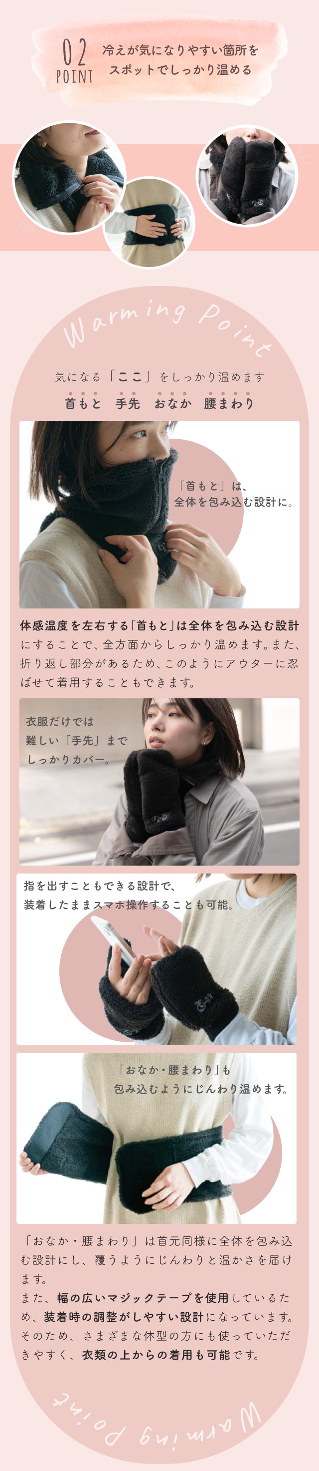 - 特に冷えが気になりがちな「首元」「手指」「背部」「腹部」の4箇所をしっかりカバー