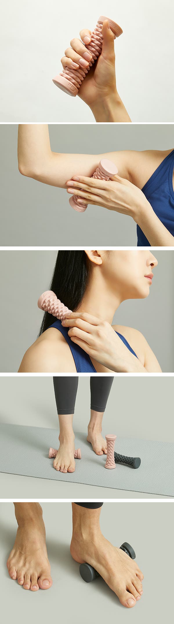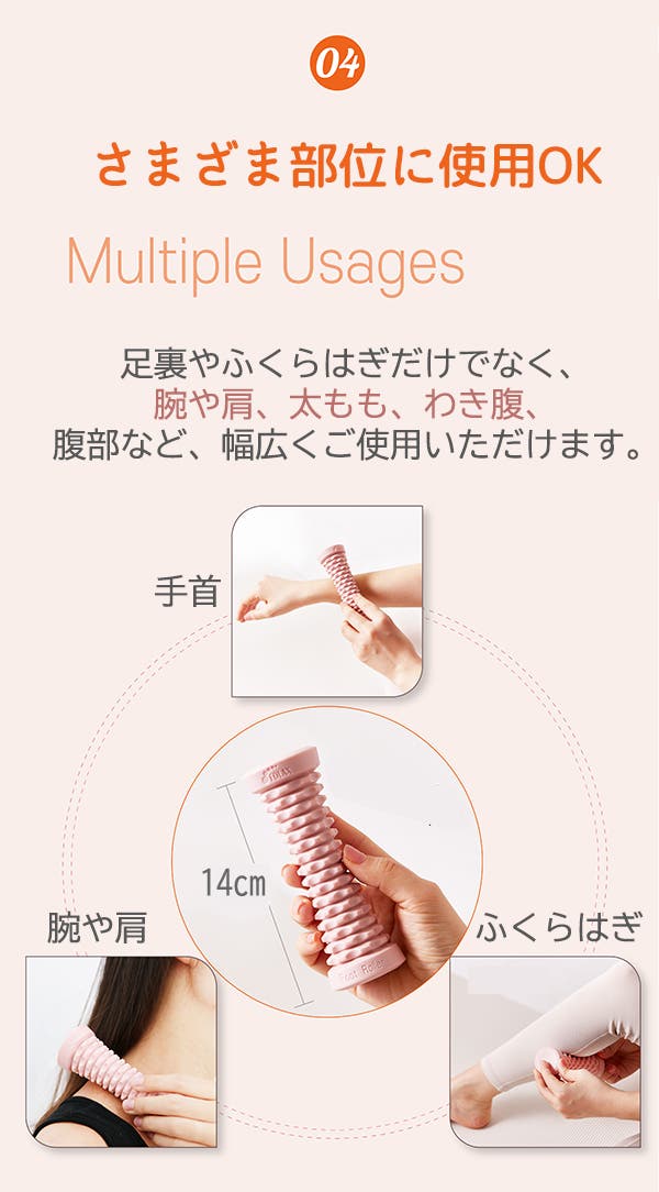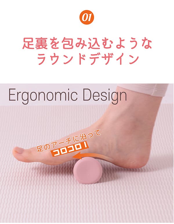 足裏やふくらはぎなど、凝り固まった部位に当ててローリングしてください。ゴム素材を使用しており、滑り止めだけでなく、床へのダメージを最小限に抑えます。また、滑らかな使い心地と丈夫な作りが特徴で長い間ご愛用いただけます。