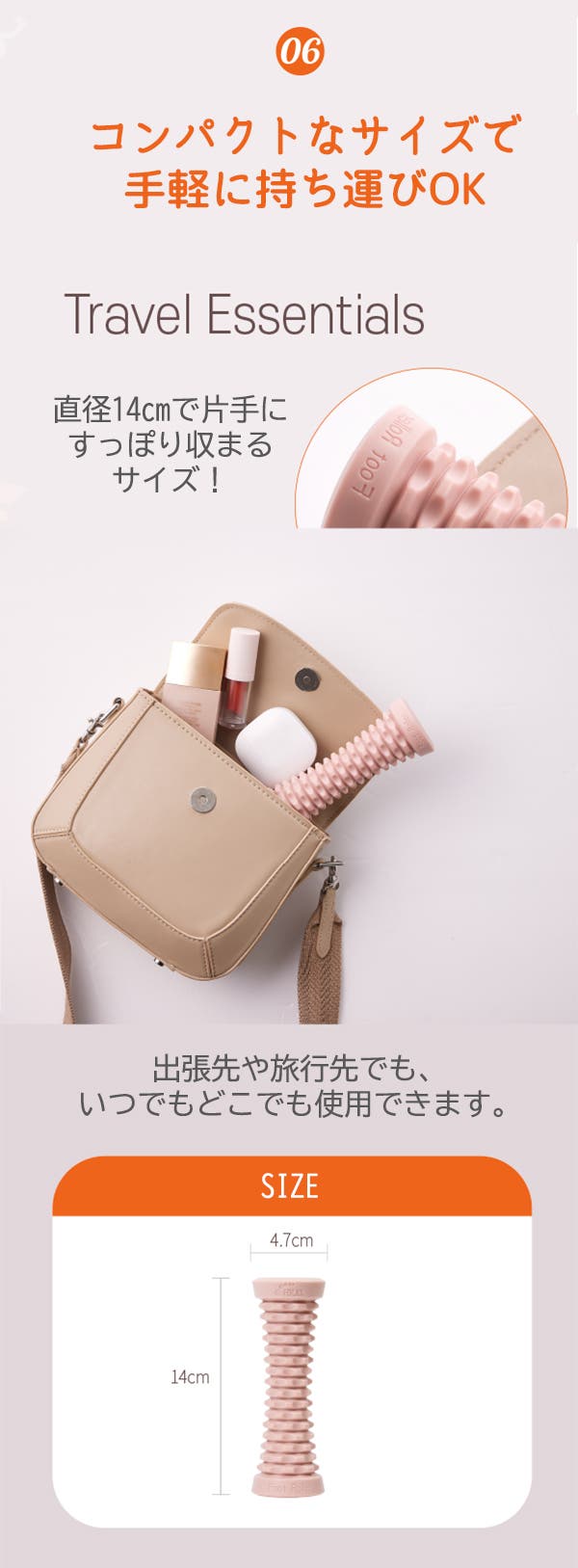 長時間歩く際は、バッグにフットローラーを入れて持ち歩きましょう。