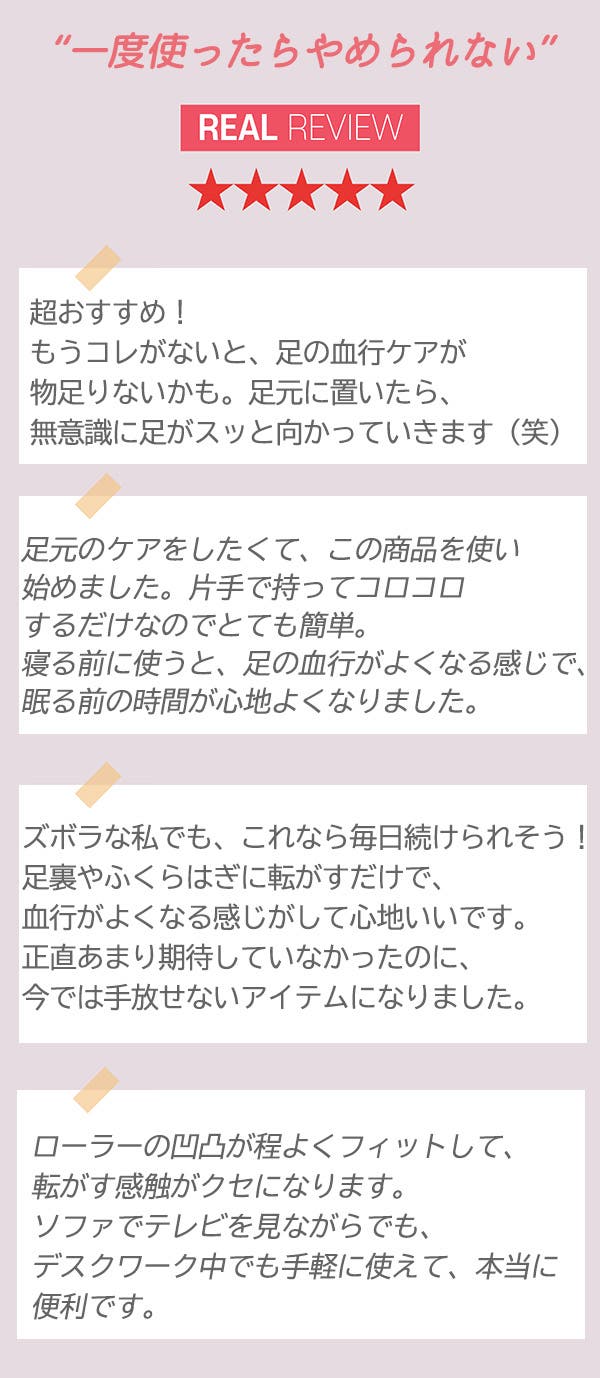 テレビを見ながら、ソファでくつろぎながら、朝起きてすぐに…足元に置いてコロコロするだけ!床に置いて足を転がすだけで、突起ローラーが回転し足裏やふくらはぎを気持ちよく刺激します。