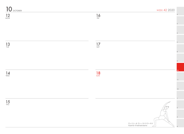 1週毎にヨガポーズ(ポーズ名入り)を掲載。