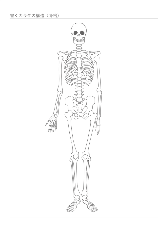 カラダの白地図として骨格を覚えるために部位の名前を書いてみたり、関節の動き方を書いてみたり好きなように書き込むことができます。