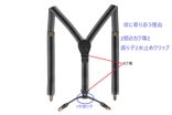 3.すべて国産の材料を吟味、バック連結に拘り(角環2個、振り子Y字2点クリップ)。4.これにより付け心地の良い体の動きに合わせてついてくるサスペンダーを開発。