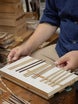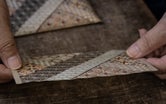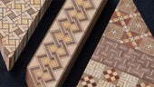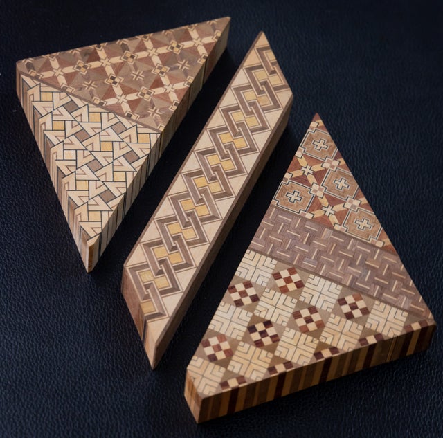 寄木細工は天然木材の色が織り成す幾何学模様が特徴です。寄木は木材を細い三角や四角のスティック状に切り出し、それらを幾何学模様が表れるように組合せて巻きます。そして出来た木片をまた組合せで大きな種木を作ります。