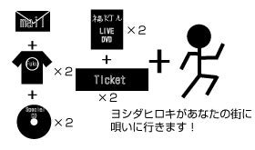 お礼の御手紙1通、ヨシダヒロキデザインの福灯ルTシャツが2枚、CS放送「SKY A Sports+」阪神タイガーステーマソング「僕のスーパースター」の弾き語りVer.CDが2枚、今回収録されるライブDVDが2枚、2015年にいつでもどこでも使えるライブ招待チケットが2枚(*1)、そして、あなたの好きな場所でライブしに行きます!(*2)