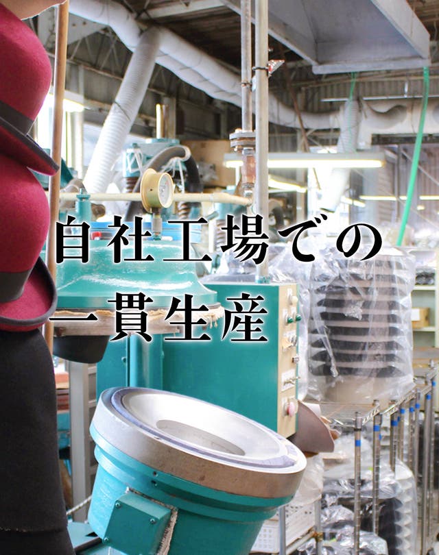 木型やアルミ製の型を使いプレスする製法を"製帽"と言います。今現在、製帽を生業としている国内工場は数社しかありません。YOSHIHARU WADAが生産を依頼している共同製帽社は、大阪において90年以上の歴史を誇る老舗工房です。岐阜の自社工場で一貫生産を行っております。どの工程も技術の高い職人が1点ずつ目で見て、手で触れて丁寧に仕上げられています。