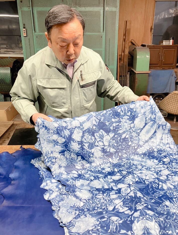 本来、植物由来の本藍(酸性)と皮革(アルカリ)は相性が悪く、染色すると皮革自体が硬くなり縮んでしまいます。そこで、伊藤産業で硬化と縮みを防ぐ下処理を行います。