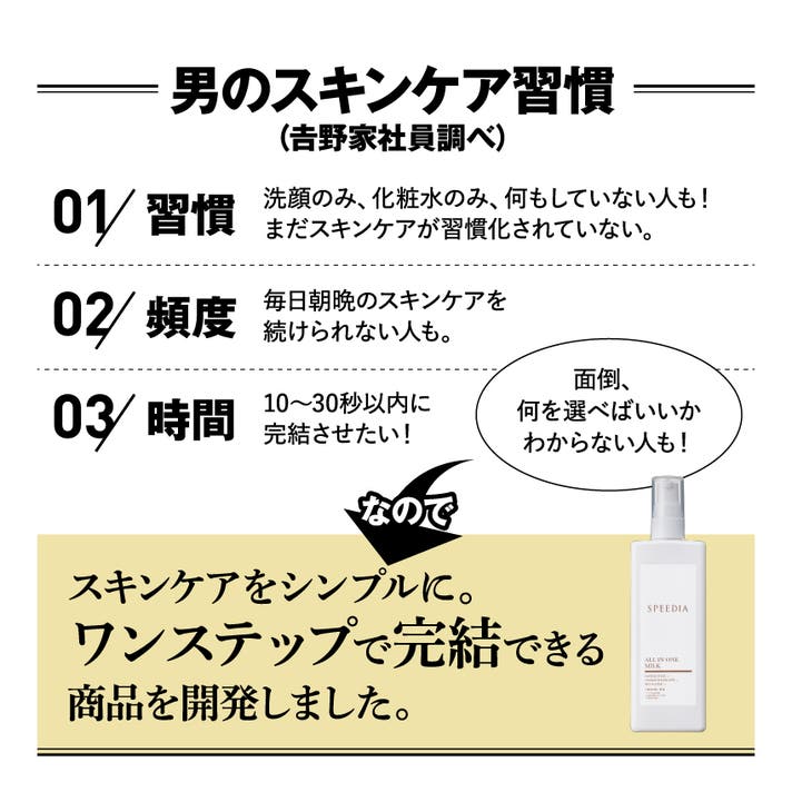 吉野家だからこそ辿り着いた、男性のためのオールインワンミルクです。