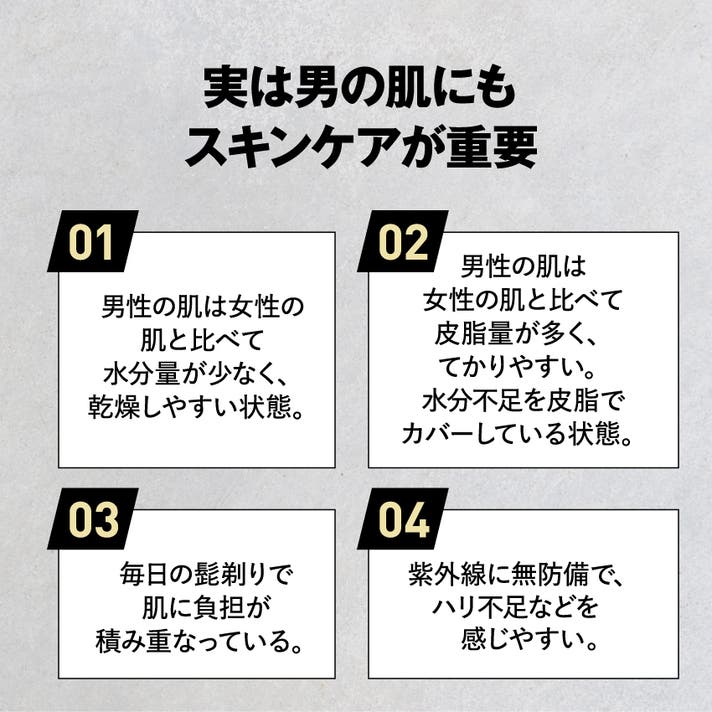 - 忙しい男性の味方。洗顔後1本で顔も体も髪もケアできるメンズコスメ。