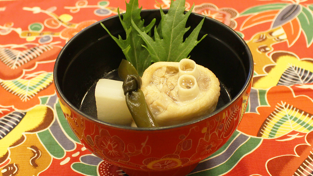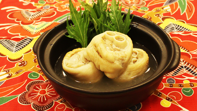 四つ竹のてびちは豚足を骨ごと輪切りにし、時間をかけて中がとろとろになるまで煮こんだ料理です。料理長こだわりの塩だれは、琉球王国時代の伝統を継承しながらも、皆さんの食卓に合わせた味付けへと調理しています。