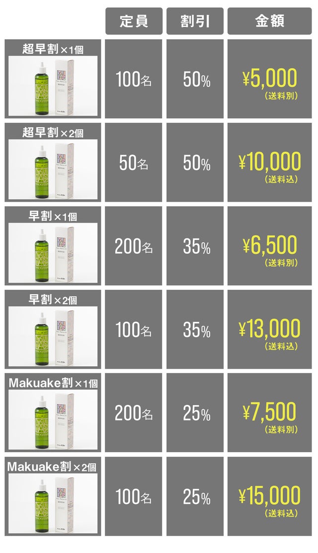 私たちは育毛剤を製造する為、生産工場と何度も打ち合わせを繰り返し誠心誠意進めてきました。 デザインなどパッケージにもこだわり老若男女問わずお使いいただけるように仕上げました。 ※スケジュールは、あくまでもプロジェクト公開時点の予定です。応援購入の性質上、配送遅延 恐れがございます。プロジェクト内容に変更がある場合はできるだけ早く活動レポートなどで共有を行う予定です。 ※原則として、配送遅延に伴う応援購入のキャンセルは出来ませんが、リターン配送予定月から1ヶ月を超えた場合には、希望者に限りキャンセルにて対応させていただきます。 様々なお客様のお悩みに少しでもお力添えになりますよう、育毛剤を使用していただいた皆様が笑顔になっていただけるように私たちが心を込めて対応していただきますので応援よろしくお願いいたします。