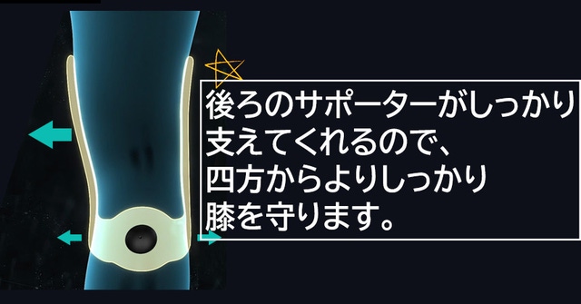 後ろのサポーターがしっかり支えてくれるので、四方からよりしっかり膝を守ります。