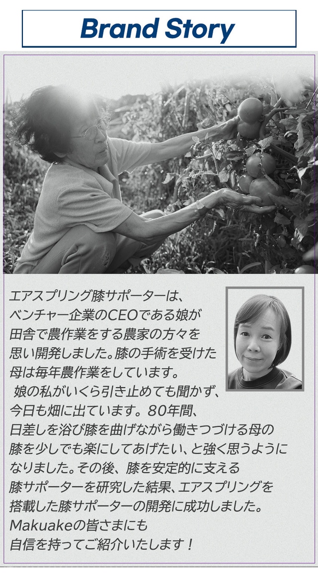 株式会社セルアップの代表、ホンです。エアスプリング膝サポーターは、韓国のベンチャー企業のCEOである娘が田舎で農作業をする農家の方々を思い開発しました。膝の手術を受けた母は毎年農作業をしています。 娘の私がいくら引き止めても聞かず、今日も畑に出ています。 80年間、日差しを浴び膝を曲げながら働きつづける母の膝を少しでも楽にしてあげたい、と強く思うようになりました。その後、 膝を安定的に支える膝サポーターを研究した結果、エアスプリングを搭載した膝サポーターの開発に成功しました。 Makuakeの皆さまにも自信を持ってご紹介いたします!