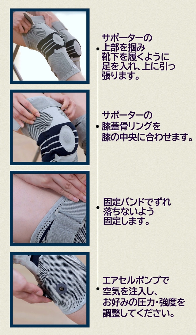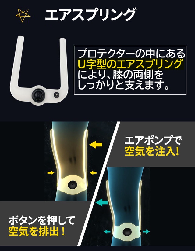 - 空気でパンパン膨らむ!U字型のエアスプリングにより、膝の両側をしっかりと支えます。