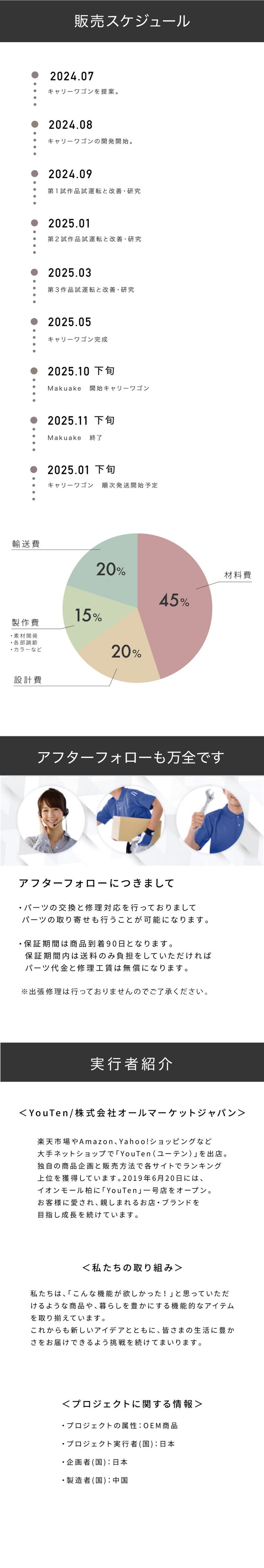 ※使用感等に関する返品・返金はお受けいたしかねます。 ※開発中の製品につきましては、デザイン・仕様が一部変更になる可能性もございます。 ※応援購入の数が想定を上回った場合、製造工程上の都合等により出荷時期が遅れる場合がございます。 配送に遅れが生じる可能性が判明した場合、直ちにご報告させていただきます。 ※本プロジェクトを通して想定を上回る皆様から応援購入頂き、現在進めている環境から量産体制を更に整えることができた場合、正規販売価格が販売予定価格より下がる可能性もございます。 ※本プロジェクトの実施において十分確認は行なっておりますが、並行輸入品、類似品が発覚する可能性がある点、ご了承願います。 応援購入サービスの性質上、以上の注意点につきましてあらかじめご理解とご了承いただいた上で応援購入いただきますよう、よろしくお願い申し上げます。 本文中に記載させていただいたスケジュールは、あくまでプロジェクト公開時点の予定です。応援購入の性質上、配送遅延のおそれがございます。 原則として、配送遅延に伴う応援購入のキャンセルはできませんが、応援購入配送予定月から3ヵ月を超えた場合には、希望者に限りキャンセルにて対応させていただきます。 ※一部国内に類似品が出回っている場合がございます。弊社では他社の類似品に関してのお問い合わせには対応できませんのでご了承ください。 ※本文中に記載させていただいたスケジュールは、あくまでプロジェクト公開時点の予定です。応援購入の性質上、配送遅延のおそれがございます。 ※原則として、配送遅延に伴う応援購入のキャンセルはできませんが、リターン配送予定月から3ヵ月を超えた場合には、希望者に限りキャンセルにて対応させていただきます。