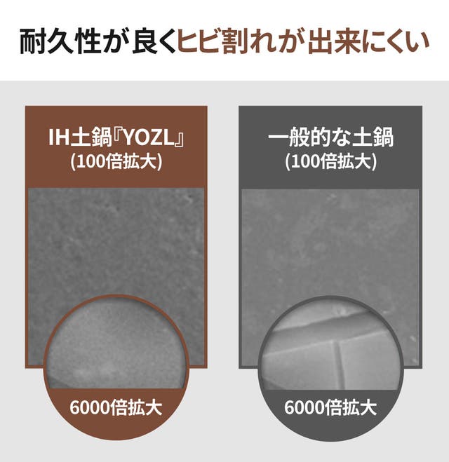 IH土鍋『YOZL』は独自技術の製作・配合方法により、一般的な土鍋に比べて亀裂やひび割れが出来にくく丈夫です。