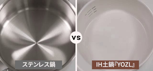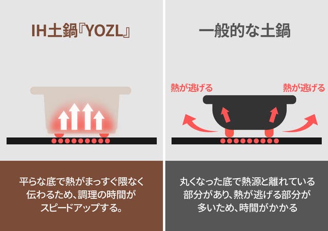 IH土鍋『YOZL』は鍋の底が平らに設計したため、通常の土鍋よりも熱が伝わりやすい形です。