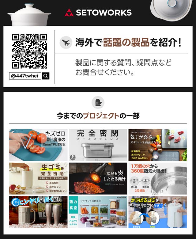 setoworksは日本の新しい製品を外国にいち早く紹介する事業を始め、海外の新しい商品や直接企画した多様なプロダクト製品を日本国内に紹介する事業を展開しています。たくさんの応援の程よろしくお願い致します。