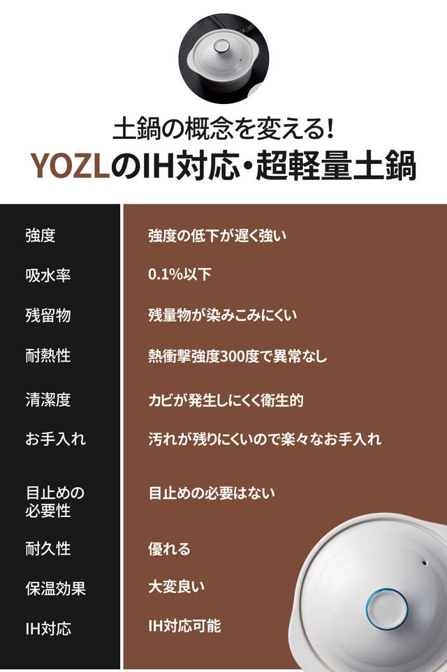 独自の製作方法と主原料ペタライトにより、IH土鍋『YOZL』は高い耐熱性で非常に割れにくいのが特徴です。