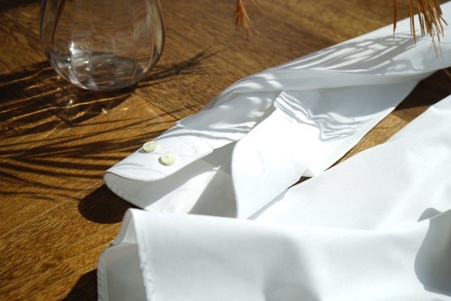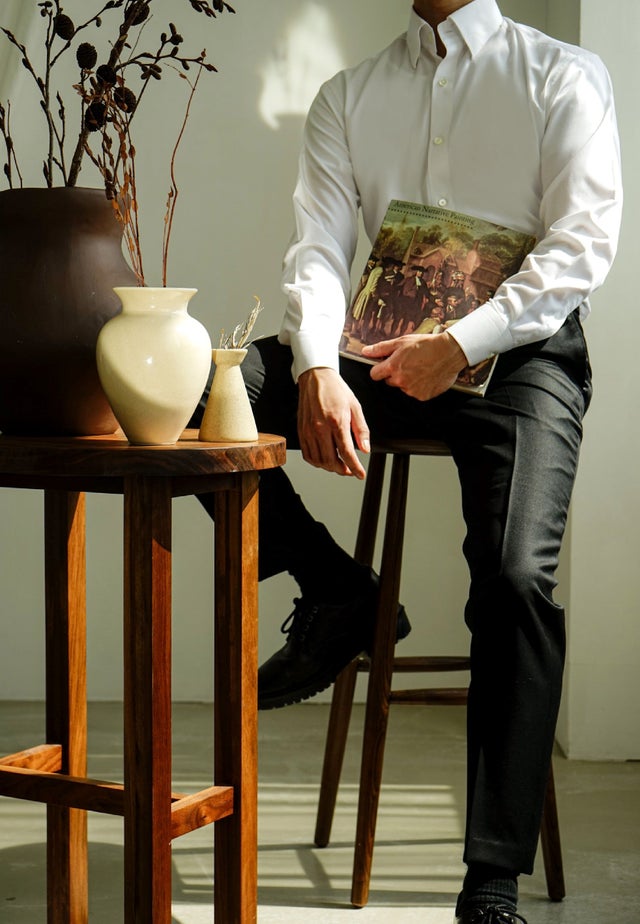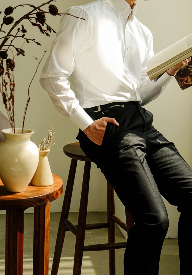 すっきり落ちるミシン線がシャツのシンプルかつモダンな雰囲気をより一層生かしています。