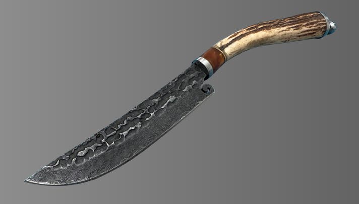 滑らかなカーブを描く鹿角のハンドルと、重厚でありながら繊細な表情を見せるダマスカス鋼の刃。