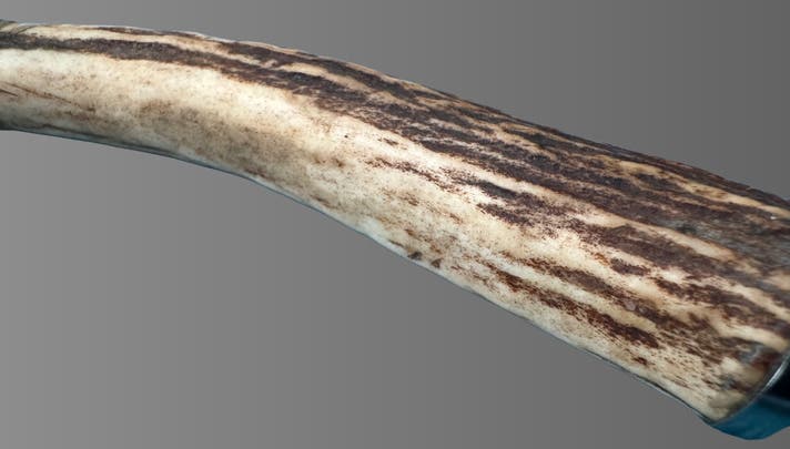 ハンドル部分は、硬質で密度の高い鹿角材を丁寧に削り出し、