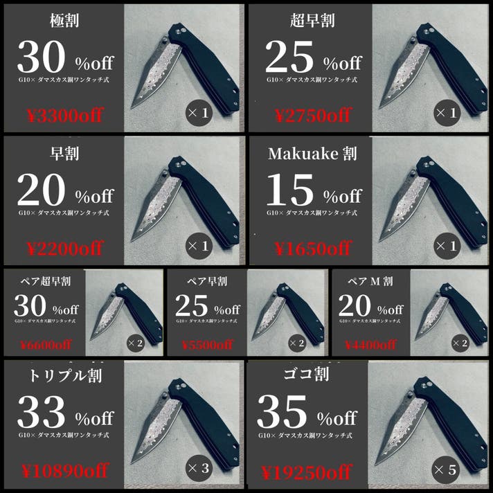 「Makuake(マクアケ)」は、実行者の想いを応援購入によって実現するアタラシイものやサービスのプラットフォームです。このページは、 プロダクトカテゴリの 「G10×ダマスカス鋼を握る!グリップ力、切れ味◎無骨と美が共存する、現代の相棒」プロジェクト詳細ページです。