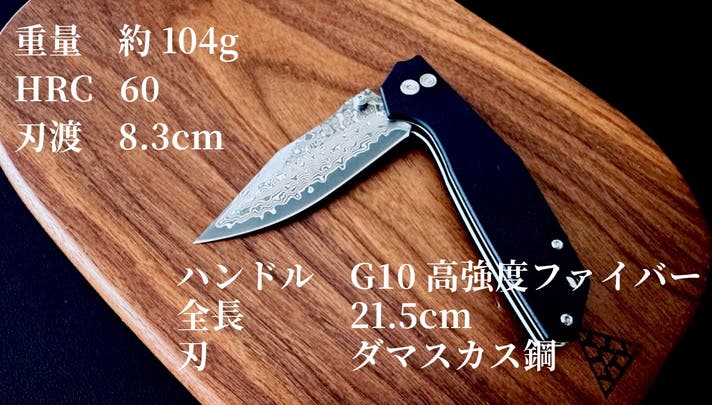 - ダマスカス鋼の一点物デザインと高硬度、G10樹脂の強靭なハンドル