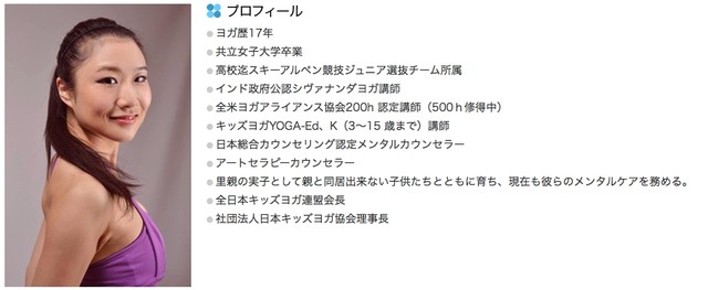キッズヨガ協会のHPによると、キッズヨガ講師免許は大人のヨガ講師免許も所持しており、成長段階に応じた言葉選びやシークエンスを、子供たちのその時の調子をみながら柔軟に対応し、子供たちが飽きない楽しいクラスを提供していますとのこと。