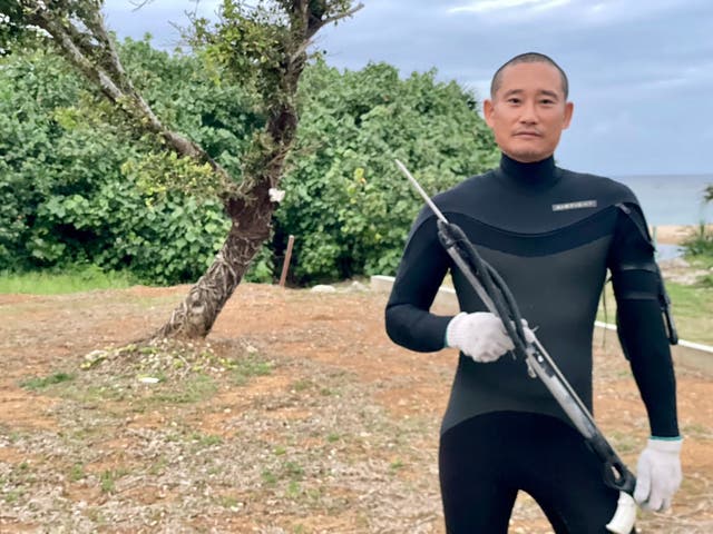 *彼の漁のスタイルはスピアフィッシングと言う水中銃を使った素潜り漁。夜間真っ暗の海の中で魚から伊勢海老や貝類まで様々な食材をゲットする