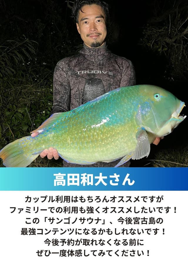 マクアケ限定プランであるサウナハット/サウナポンチョをお貸しするサウナ満喫宿泊プランに、素潜り漁師であるオーナーの嶋原克仁さんが提供する宮古島満喫海鮮フルコースが付いたプラン(海鮮コース+Makuake限定宮古島酵素ジュース)になります。