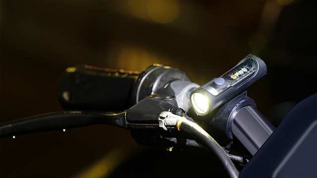 メインライトの照射距離は最大100メートルまで。点灯すると闇を切り裂いて夜道の状況を速やかに確認!