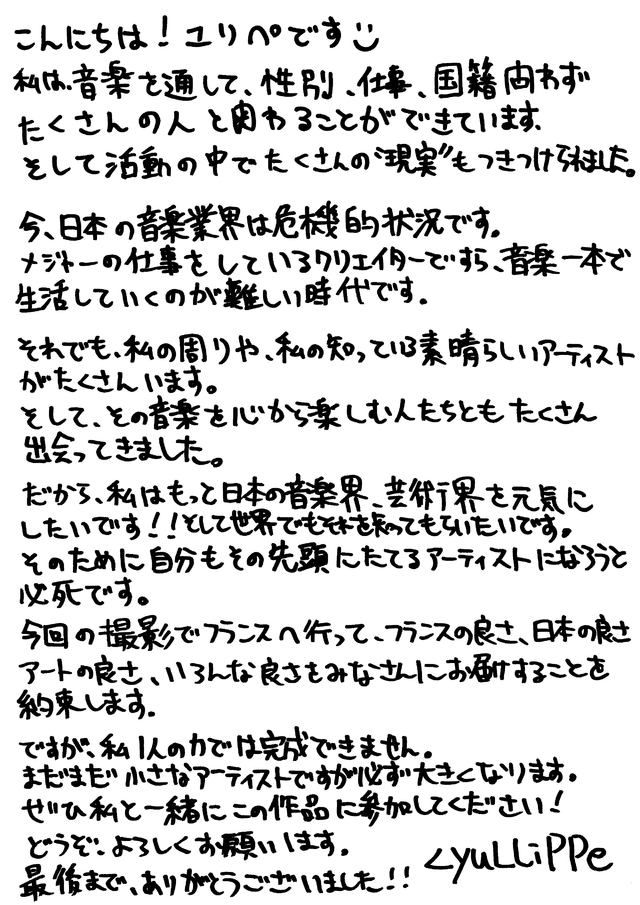 今年で21歳になる初めの大きな第一歩の作品として、∠yuLLiPPeの音楽ルーツであるフランスで作品をつくりたい!世界でももっと活躍したい!