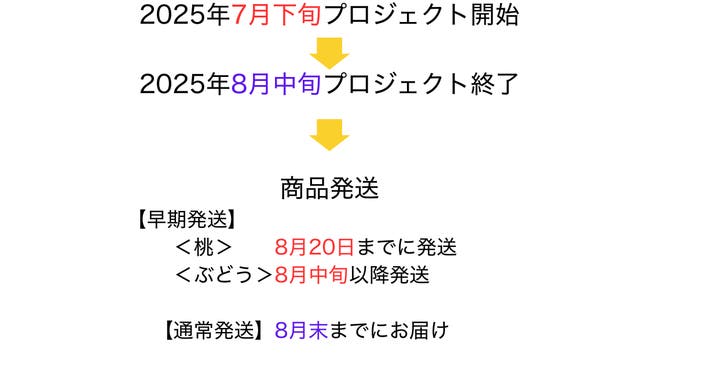 A. 発送は早期リターンについては【桃:8月20日まで、ぶどう:8月中旬以降】、通常リターンは桃のみで【8月末まで】に順次行います。天候や収穫状況により前後する可能性がありますので、ご了承ください。お届け時期の目安は、各リターンに記載の予定日をご確認ください。