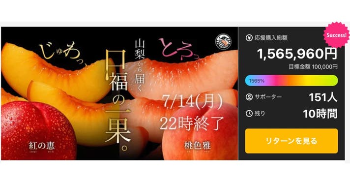本プロジェクトでお届けする商品は、生鮮品(農作物)となります。 そのため、天候状況により、収穫時期が例年と前後する場合がございます。 予定より発送が早まる、または遅れる可能性があることを、あらかじめご了承ください。 山梨県は比較的台風などの影響を受けにくい地域ですが、万が一、自然災害等により不作が発生した場合には、プロジェクト表示金額相当分にあたる別品種のモモ ブドウ等をご用意し、補填対応をさせていただきます。 (その際は、事前にご案内のうえ発送いたします。) また、収穫と発送作業の特性上、配送日時のご指定は承っておりません。 お届け時期の目安はご案内いたしますが、農作物特有の事情にご理解いただき、応援購入をお願い申し上げます。 本文中に記載させていただいたスケジュールは、あくまでプロジェクト公開時点の予定です。 応援購入の性質上、配送遅延のおそれがございます。 原則として、配送遅延に伴う応援購入のキャンセルはできませんが、リターン配送予定月から3ヶ月を超えた場合には、希望者に限りキャンセルにて対応させていただきます。
