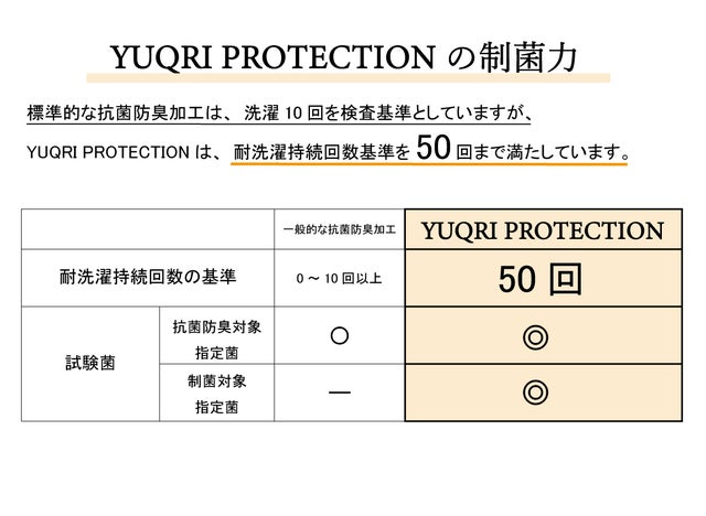 - 抗菌防臭・制菌・消臭と3つの機能に特化したYUQRI PROTECTIONを採用。