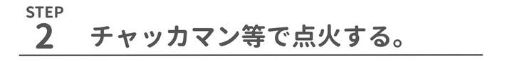 持ち手が着火部分から離れたライターなどで、燃料カップ内に火をつけます。