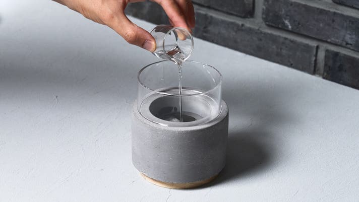 バイオエタノール燃料を周囲にこぼさないよう注意しながら、本体の燃料カップへ注ぎます。