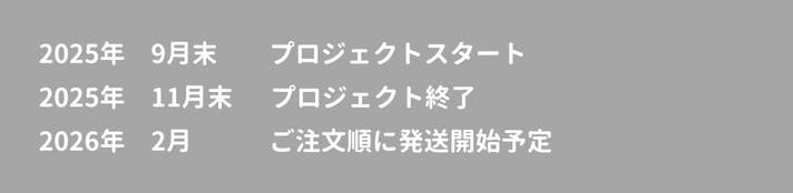 2026年2月より順次発送開始予定で、超超早割でご購入いただいた方から順番に発送いたします。応援購入多数の場合、2月下旬以降の発送となる場合がございます。発送状況は活動レポートで随時お知らせいたします。